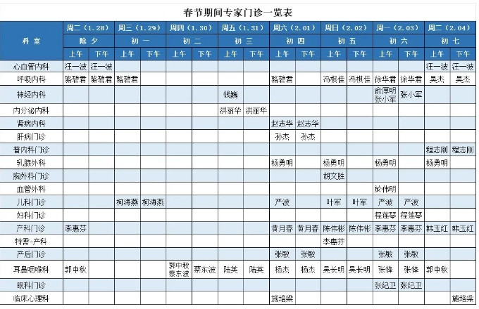 临安区第一人民医院(妇幼保健院)2025年春节期间门急诊排班如下:1月28日(除夕)至2月4日(初七)普通门诊和急诊照常开诊;本院专家门诊见下图,省市级专家门诊具体见医院公众号的推送信息。